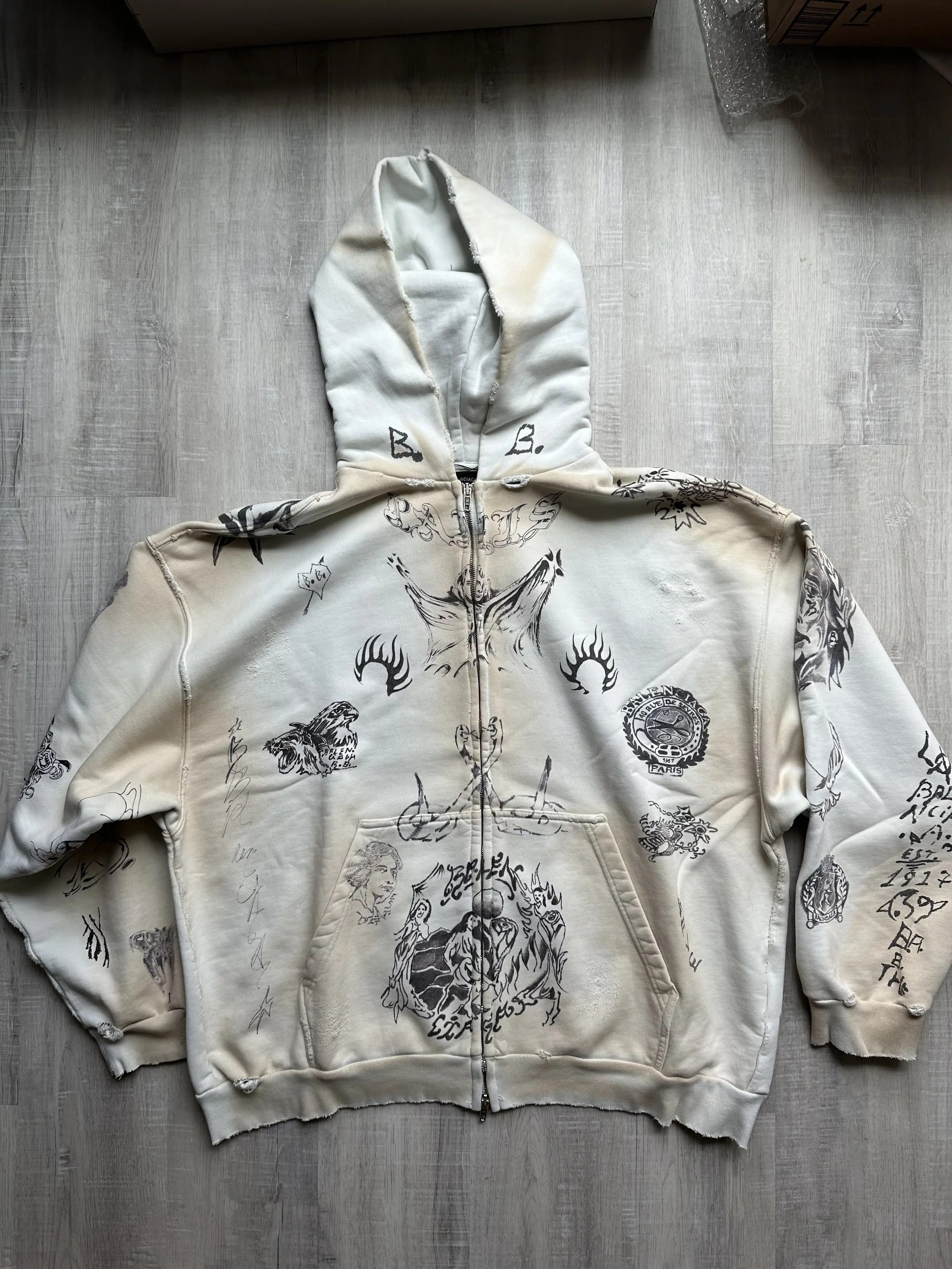 Balenciaga Tattoo Hoodie - Get free shipping on balenciaga men's terry metallic tattoo zip hoodie at bergdorf goodman. Whether you love the look of ink but fear the needle or see balenciaga's 'tat' designs as an extension of your own body art, this hoodie will surely appeal. Balenciaga hoodie made of heavyweight fleece with destroyed and dirty effect; Designed with leisure days in mind, this zip up hoody is cut from a heavy cotton fleece. Shop tacky tattoo distressed cotton fleece hoodie in black from balenciaga online at mytheresa. Browse balenciaga tattoo hoodie and more from your favorite designers at grailed, the community.